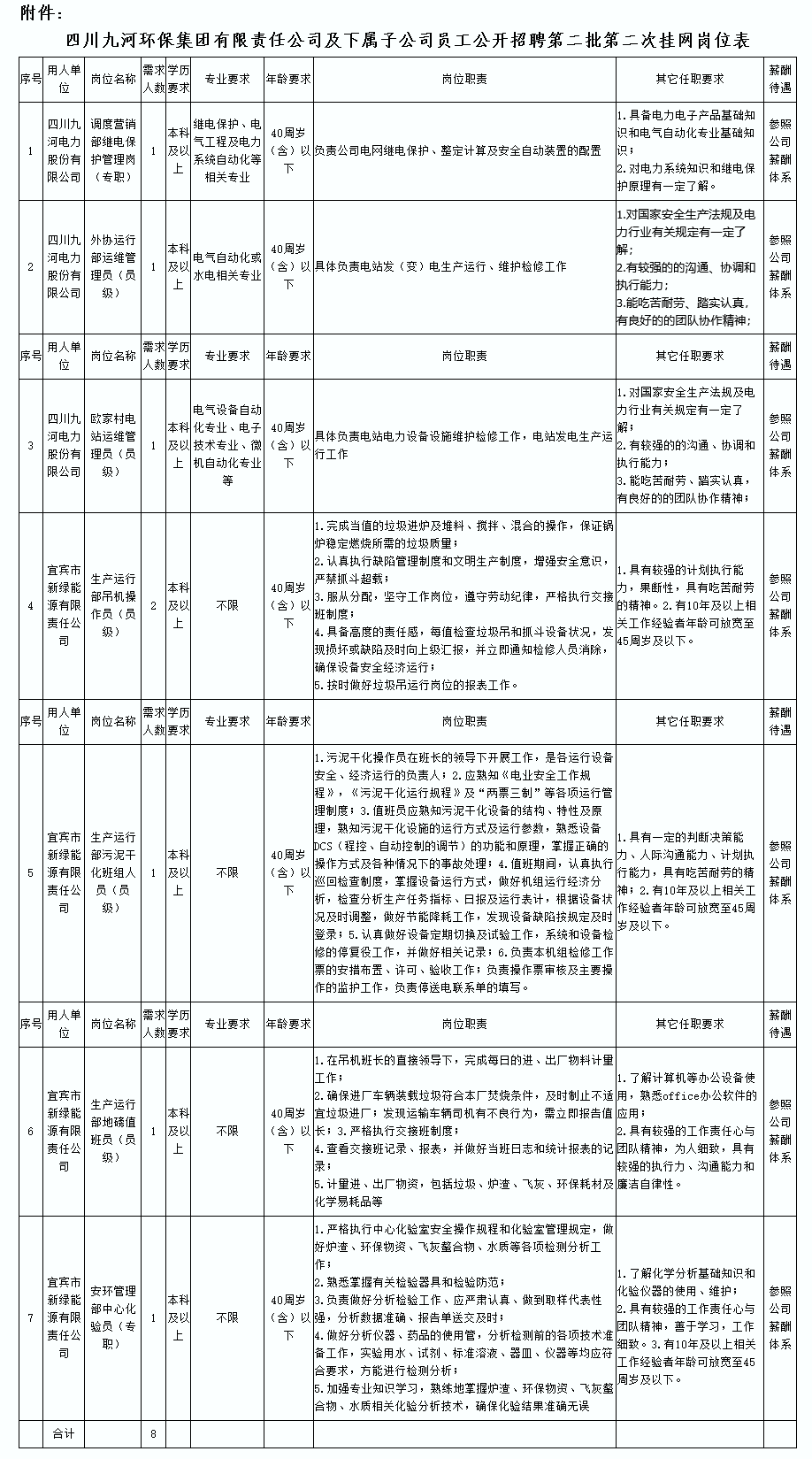受宜宾市国有企业人力资源中心委托,宜宾人才发展集团有限公司按照公开、平等、竞争、择优的原则,面向社会公开为宜宾市新能源产业有限公司下属子公司四川九河环保集团有限责任公司招聘8名工作人员。现将有关事项公告如下。
