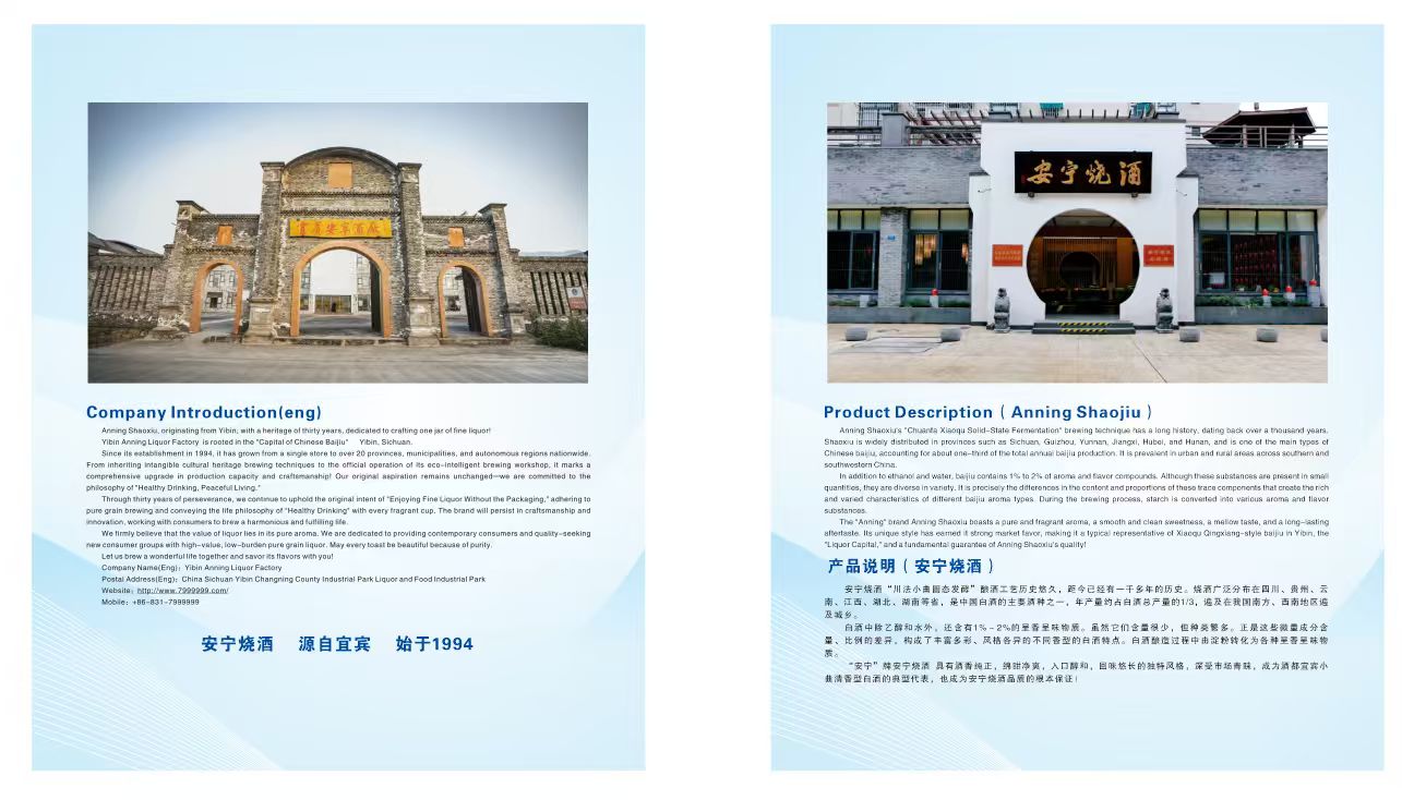 宜宾安宁酒厂位于中国白酒金三角核心产区、中国白酒之都——四川宜宾,坐落于国家级风景名胜区蜀南竹海长宁县,毗邻国家AAA级风景旅游区、佛教圣地佛来山的开佛镇。宜宾安宁酒厂是产销一体的全国加盟企业,生产的“安宁”牌安宁烧酒,是以高粱、玉米等为原料,采用具有传承价值的“川法小曲固态发酵”传统酿酒工艺,经老窖发酵,长期贮存,精心调制而成,具有酒香纯正,绵甜净爽,入口醇和,回味悠长的独特风格。企业经过三十余年的发展,形成了以清香型、浓香型两大香型为主体,以散酒、个性化酒、果酒为主要产品体系,深受市场的青睐。