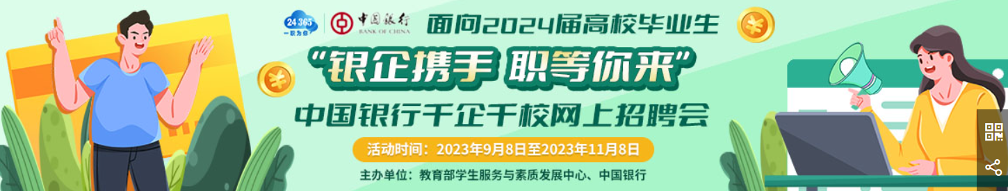 为贯彻落实党中央、国务院促进就业决策部署,坚持就业优先战略,教育部学生服务与素质发展中心联合中国银行共同举办面向2024届高校毕业生“银企携手 职等你来”中国银行千企千校网上招聘会活动。